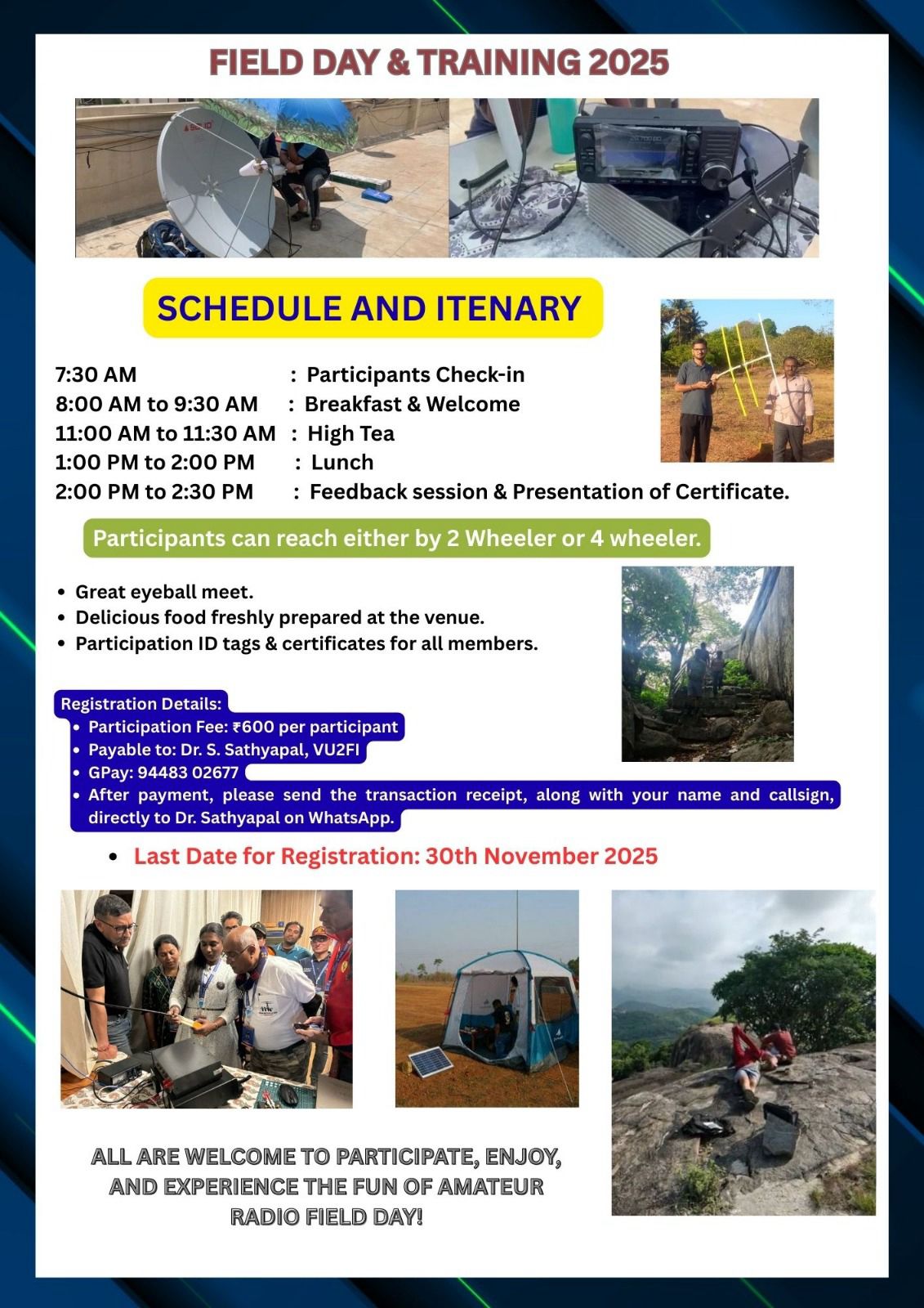Highlights: QRP DX ops, HF demos, QO-100 setup, VHF/UHF activities, antenna demonstrations, food by Chandru Caterers, and more