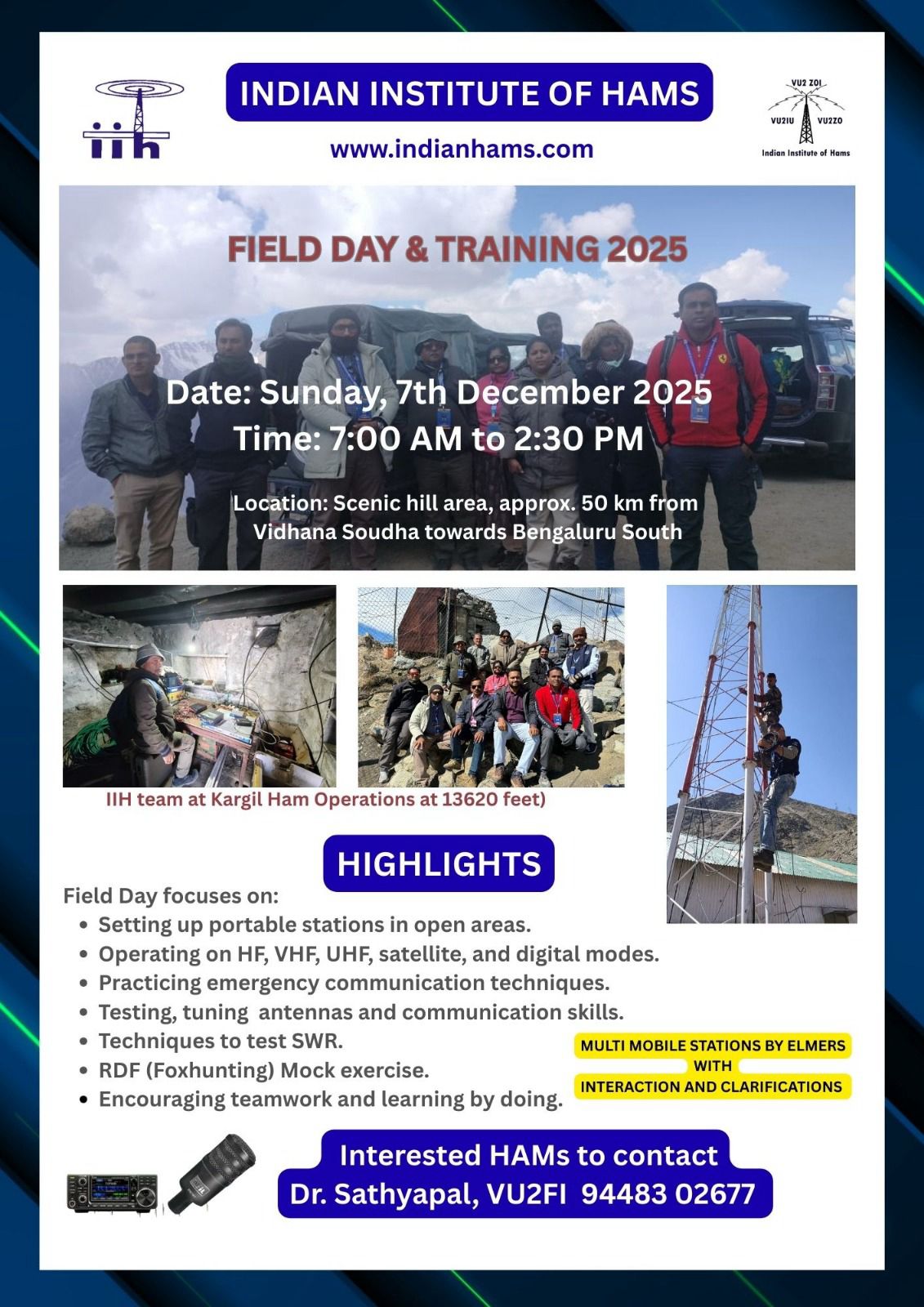 Highlights: QRP DX ops, HF demos, QO-100 setup, VHF/UHF activities, antenna demonstrations, food by Chandru Caterers, and more