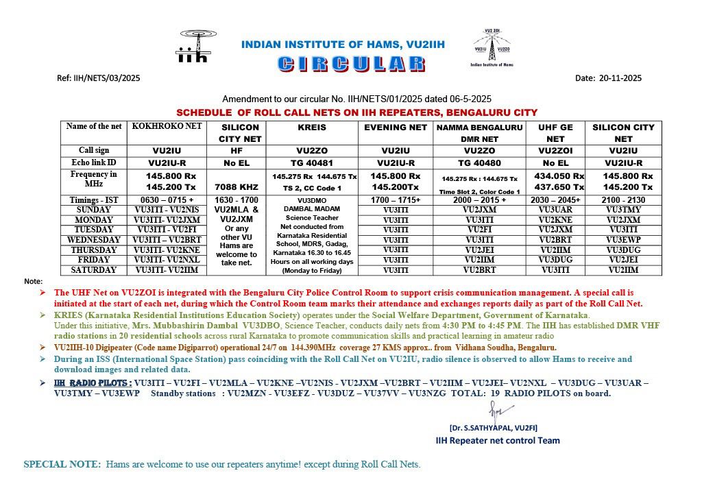 INDIAN INSTITUTE OF HAMS (IIH) was established as a registered trust in 1993 for promoting Amateur (HAM) Radio in India, has reached yet another milestone of completing 25 years of continuous service. IIH is founded by Dr. Sathyapal, VU2FI and Sri. R.J.Marcus VU2VTM